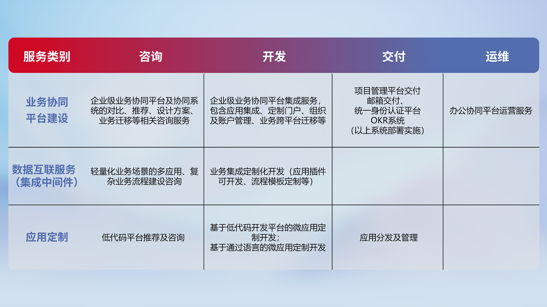 针对钉钉、、、、企微、、、IDaas等平台级产品提供产品的规划、、方案、、、交付、、、、定制化开发等服务,,,实现如统一协同办公、、、、智能客户服务、、、混合会议管理、、智能数据查询、、、等业务场景,,实现数字化转型。。
